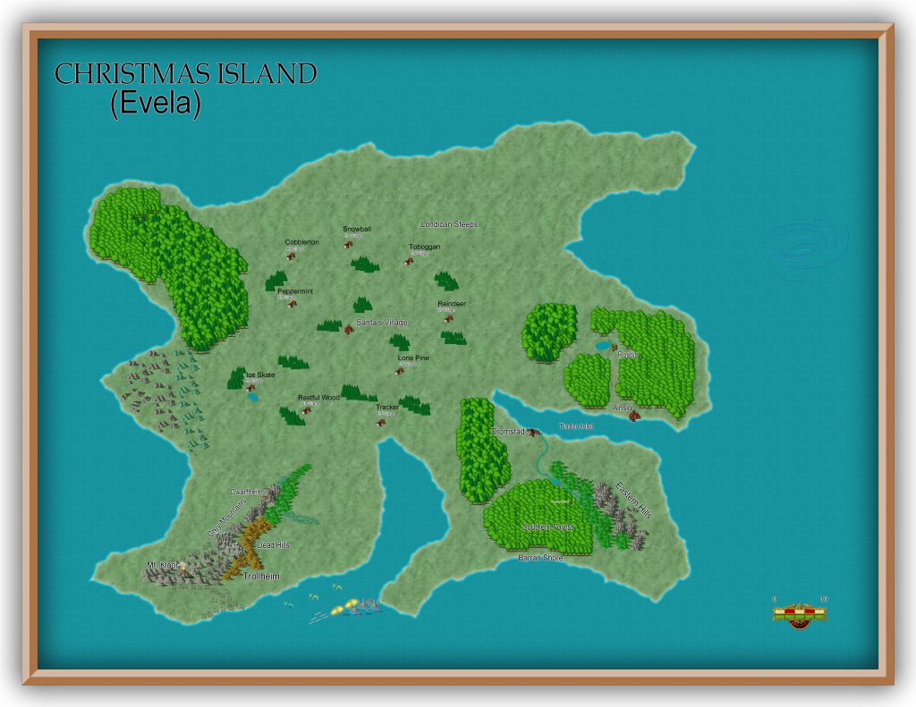 Santa’s Village: When the original Santa Claus arrived on Evela, he met the Elves, who suggested that he go to the north pole of Dondavar, which happened to be near the center of Evela. There, around the giant tree that stands at the exact pole, Santa built this village with the help of the elves. Later, after Santa Chris Kringle took over, the village was renamed to Auroral.